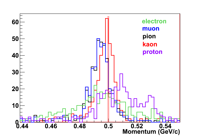 The red dotted line is the "real" value. You can see that the kaon hyp gives the best results, the pion/muon (almost identical) are missing the momentum of a bit, and have worse resolution, electrons and protons have very bad results.