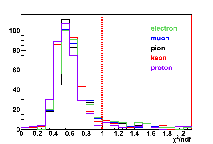 - about separating different particle hypothesis from chi2/ndf: This would be very interesting for PID purposes. I am not surprised that the chi2/ndf distributions look similar. The difference in chi2 must be very small for each fit. But it would be very interesting to know: