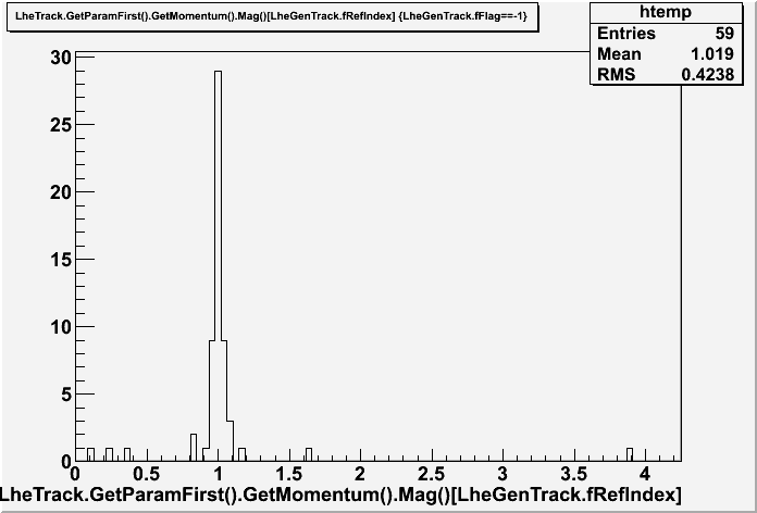 You can see these tracks have a correct momentum, and even theta seems reasonable. This means that, maybe, the ndf==0 is not connected to wrong initial parameters given by lhe.
