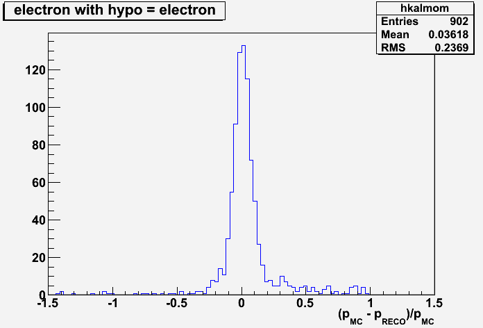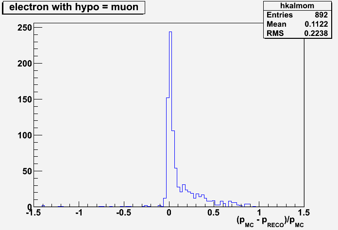 The first two figures show the momentum distributions for a simulated electron with momentum in the range 1. - 1.5 GeV/c. It is reconstructed with kalman with electron and muon mass hypothesis respectively: