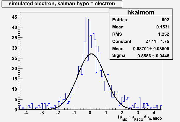 The other two figures are the pull distributions: (p_MC - p_RECO)/sigma_from_kalman in the two cases again: