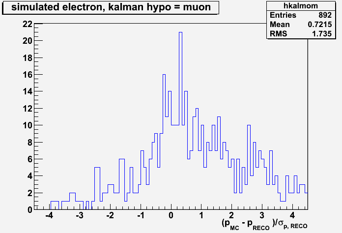 When an electron is tracked as a muon, the energy loss is wrong and the tracking error is underestimated. In the Kalman filter, the result is shifted more toward the tracking values than in the case of electrons. The errors used in Kalman is wrong and too small in any case. The results show that the pulls are bad (and this is expected, since the errors are wrong because the bremsstrahlung straggling is missing), and that the absolute differences are sharper. The mean is shifted (and I understand why) and the width is smaller (this is not completely clear to me).