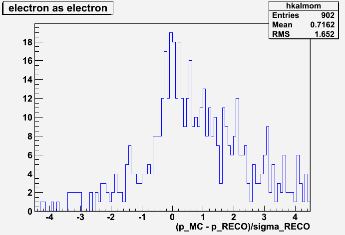 here you can see that the electron reconstructed as electron is almost a gaussian with mean = 0 (from the fit I get 0.087) and sigma = 1 (from the fit again I get 0.85). Sorry, I did the test with just 1000 events, so the statistics is quite low... The electron reconstructed as muon has a very bad shape: here it should be more evident that the right choice is the electron mass.