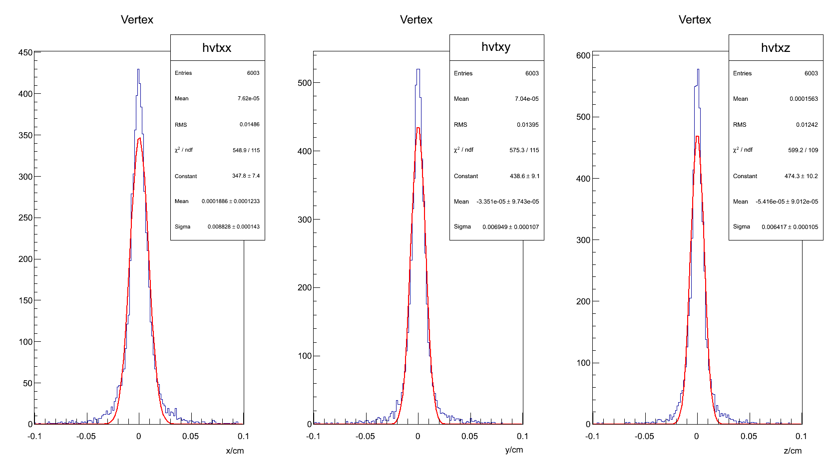 I fill histograms with the three components of the reconstructed vertices. As you can see in the attached figures I get a significantly different sigmas for x and y.
