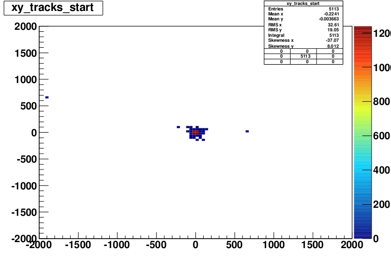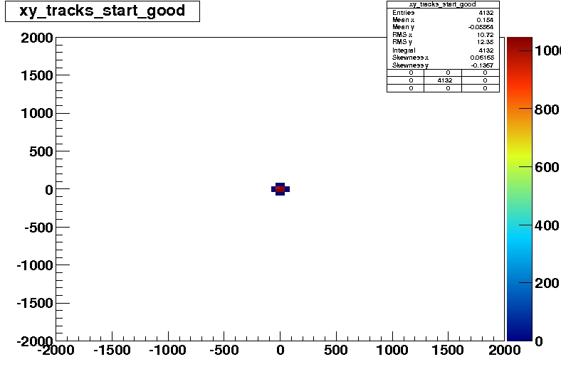 In this plot one can see the start-position of all tracks in the XY-plane, and one can clearly see some starting points which are way off. This is of course ALL tracks, also the tracks where the fits went wrong.