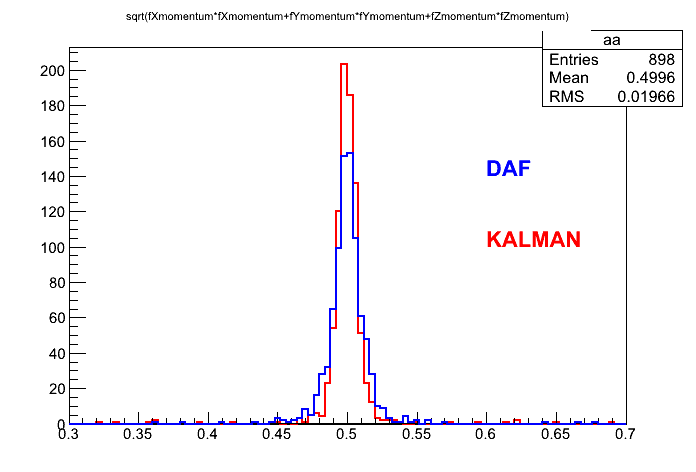I did a test, running 1000 muons at 0.5 GeV/c with STT. This is the momentum distribution after the normal kalman and after the Daf: