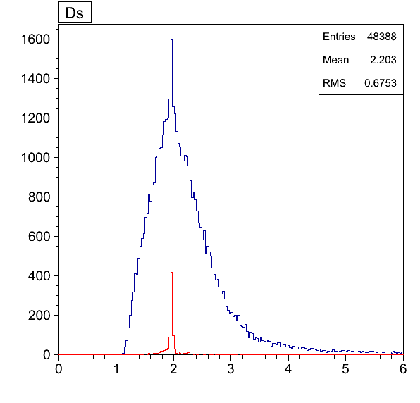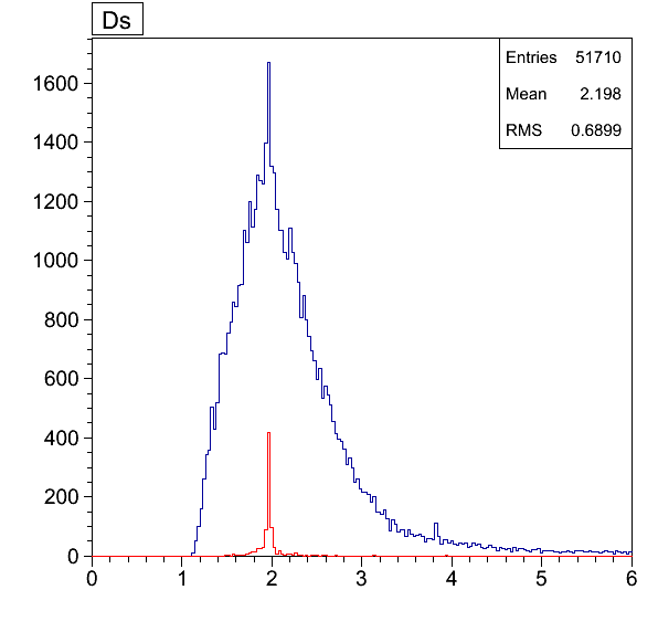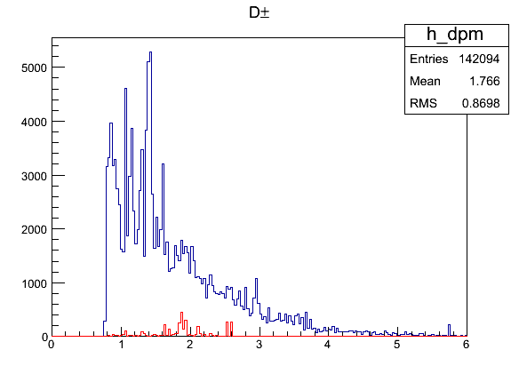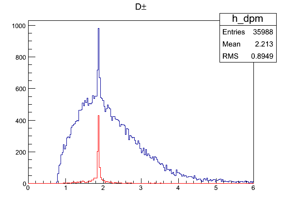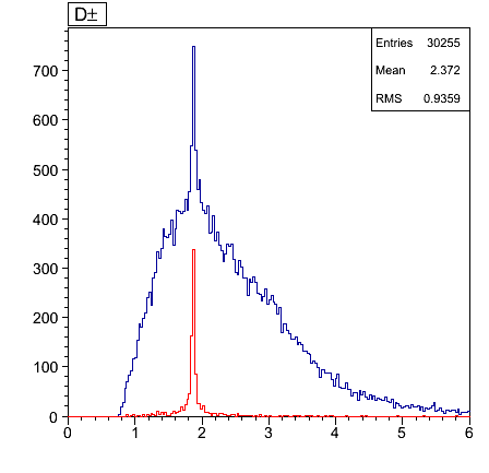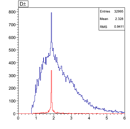 The results of an analysis of 1000 D+ -> K- pi+ pi+ (+ c.c.) events are shown in the two attached plots. The blue histogram shows all combinations, the red one is the full MC truth matched part.