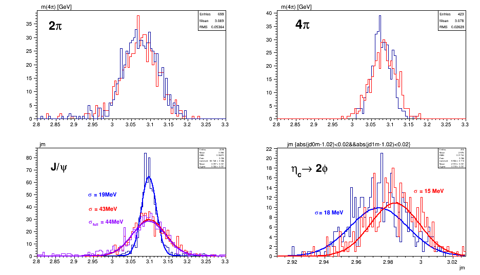However, from a quick check concerning the channels we discussed on Monday I observed, that a flat tracking efficiency of 85% already looks pretty good for 2pi, 4pi, and J/psi pi+ pi- channel. The eta_c ->phi phi channel is still inconstistent for both the sophisticated and the flat approach, where the flat values even look a bit more similar to full sim results, which is also true for the J/psi. In the figure, the red plots are from flat values, blue are from parametrization. In the J/psi plot, magenta corresponds to full sim. There the flat fast and full sim plots are basically identical with eff_trk = 85%.