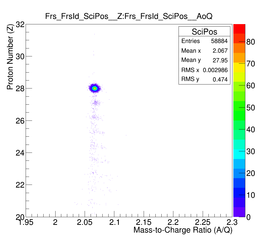 I did as you suggested and added these lines to the code, as well as for Sc41. I only performed a rough calibration (just to test it) since I don't currently have Go4 installed and I'm just using root and don't know how to fit a straight line to these plots. So, I drew a straight line manually in ROOT which seemed about right for the trends in both graphs and then extracted the coefficients for the TOFsystem.cal file. Below I've attached my uncalibrated plots (just so I know they are OK, one seems very flat?) and then the FRS PID using the scintillator positions which you can compare with the PID above using the TPCs. How does everything seem to you?
