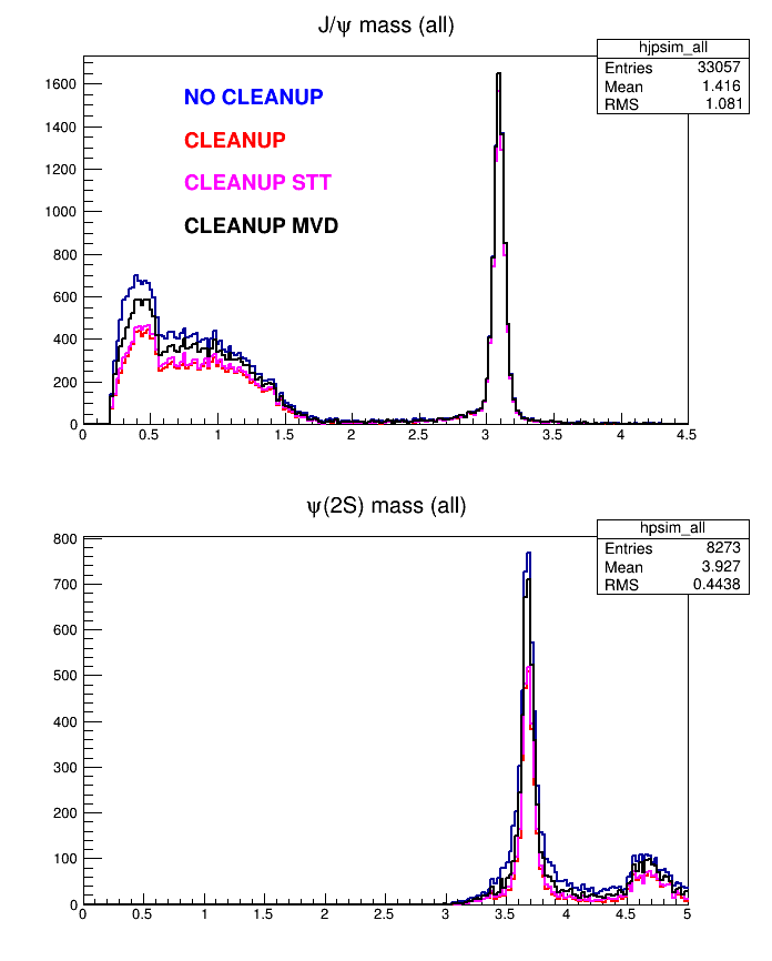 At a first glance, it seems the cleanup code affects mostly low p tracks (the pions), while the efficiency values for the high p (muons from j/psi) are consistent. Moreover, Mvd cleanup does not reduce the counts so much, the strongest effect comes from the stt cleanup. Of course the code should be verified with the event mixing (thing that I am NOT going to do now).