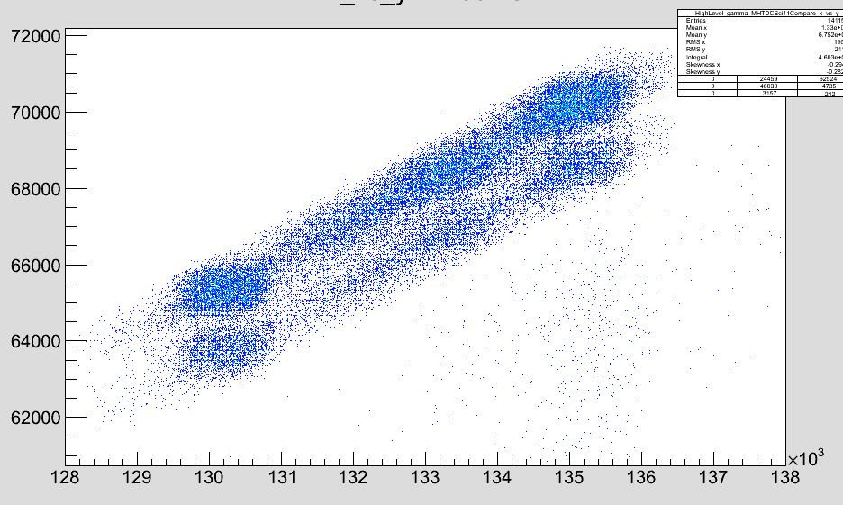 Where the x-axis and y-axis are the Sci4.1 at the USER crate and the AGATA time crate MHTDCs, respectively.
