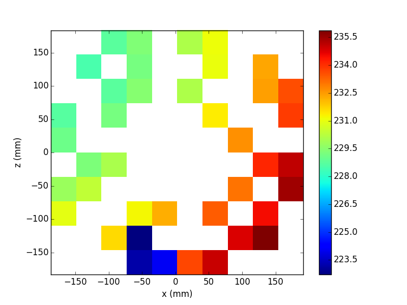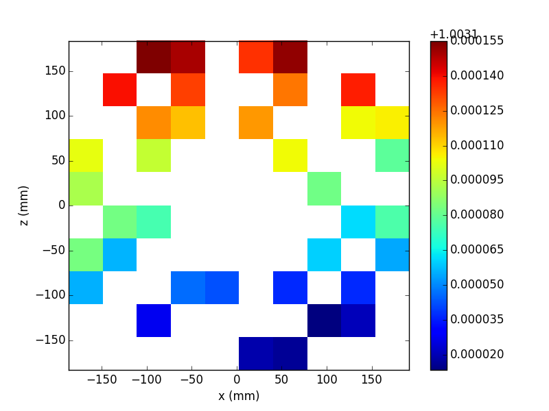 If I now shift the target center with the distance given in the report, we get a uniform radial distance, the difference in the color scale is in the order of 10^-4 mm. THe bin weights are taken here as the ratio of the corrected radial distance over the mean of the radial distance (after target repositioning).