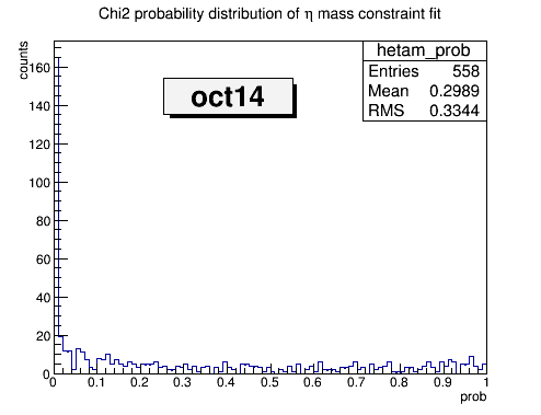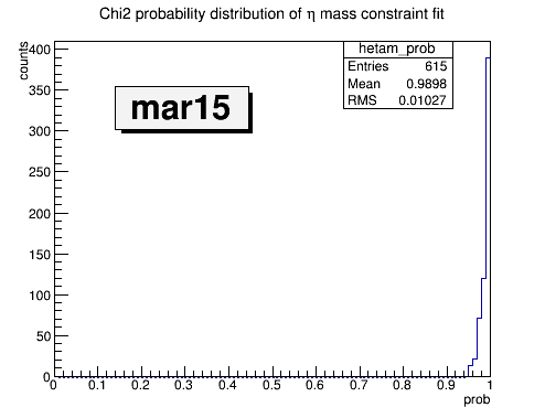 Inorder to reconstruct eta, I do mass constraint fitting on (pi+, pi- pi0) after the vtx fitting of combined charged daughters. Recently I find the probability distribution of the eta mass constraint fitting seems incorrect, where most of prob are skewed to 1 and chi2 is very small, i.e. the mean value of chi2 is 0.0003. The interesting thing is this doesn't happen in the mass constraint fittings of Ds- (pure charged daughters) and pi0 (pure neutral daughters). This problem is found with the release mar15 (#27529). I test the identical code with release oct14 (#26514), and find this problem doesn't arise there (see attached histograms). The code I used for testing is attached.