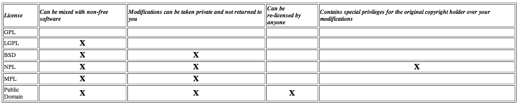 2) Do we want people to be able to take modifications private or not? If we want to get the source code for modifications back from the people who make them, apply a license that mandates this. Then, GNU Public License, GPL, and its light version, LGPL, would be good choices. If we do not mind that people take modifications private, use something like X or Apache license.