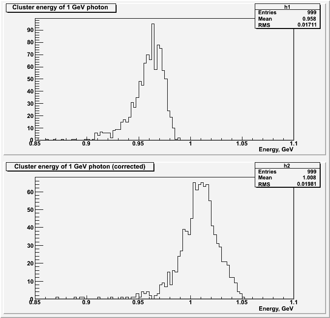 I ran this weekend simulations with more than two million photon events (boxgenerator, G3&G4) with only the EMC as geometry using the Nov08 release of PandaRoot. I looked at the averaged deposited energy (note: cluster energy!) with respect to the incident photon energy for bins over the full range in polar angle (0-180 degrees, 62 bins) and for an incident energy interval from 0-15 GeV in 34 bins (binning inhomogeously chosen according to variations in the response). The results, e.g. mean cluster energy/incident photon energy, for G3 are depicted in the figure. In the attached root file, you can find the corresponding 2D histogram together with a simulation using G4 and simulations for the Slashlyk calorimeter. In principle, one could use this file to correct the data accordingly. If there is a need for other information, let me know.