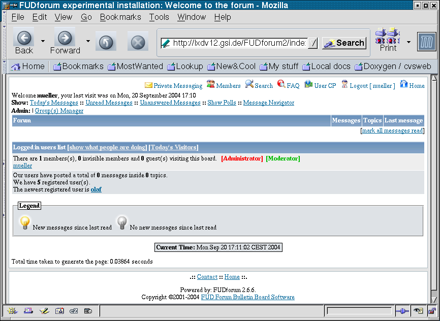 The test installation under http://lxdv12.gsi.de/FUDforum2/index.php seems to have now rather strange access rules to the one and only forum called 'TestForum'.