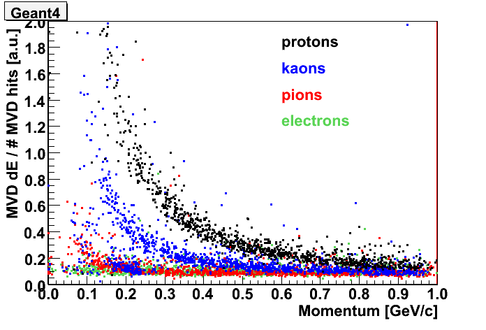 MVD dE/dx is the total energy deposited in MVD strip/pixel (MvdHits, no MC) divided by the number of MVD strips/pixels fired -> no correction for thickness or angle of the track inside the sensor