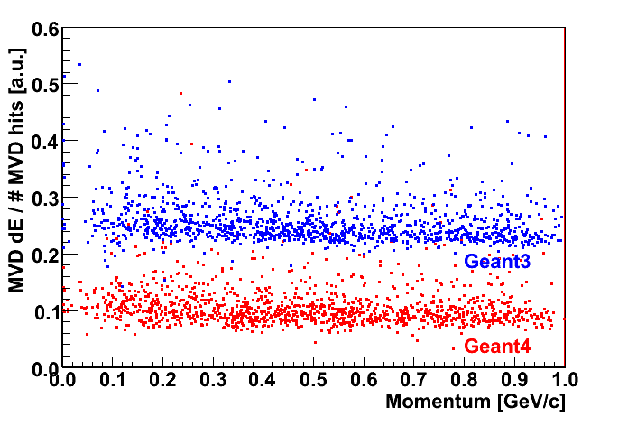 In Geant3 electrons are losing more than twice the energy lost in Geant4. In Geant4 we have a MIPS point similar to the one of the pions, while in G3 it seems that we could use MVD to discriminate between pions and electrons