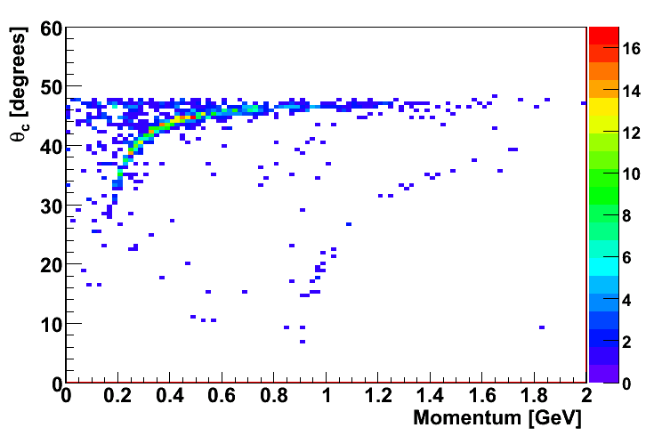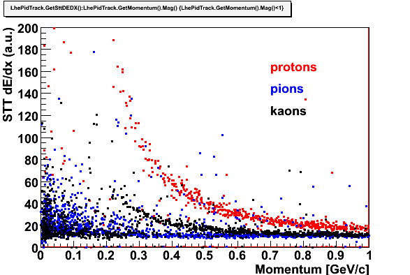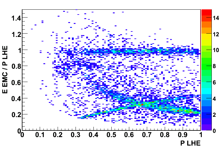 and here you are the E/P (energy loss in EMC divided by momentum) versus momentum plot for electrons (the horizontal line at 1), protons (the band which is going up), pions and muons (the band which is going down) and kaons (mixed with the pions, but a higher momenta)