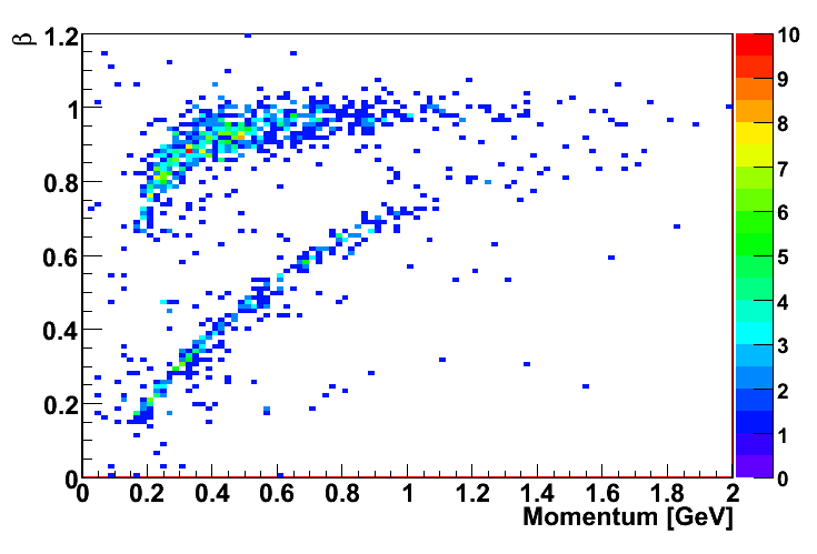 The following plot shows the tof vs momentum distribution for protons (the top one), kaons (intermediate), pions, muons, and electrons (the lower bands almost horizontal):