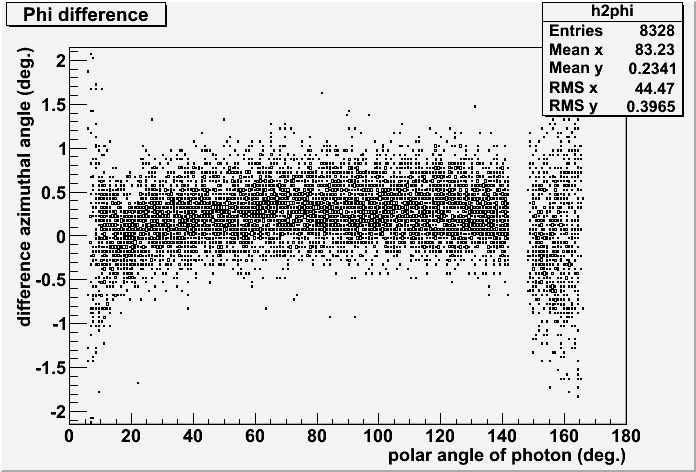 In my changes to the PndEmcXtal class, I changed PndEmcXtal::frontCentre to properly take the skewing of crystals into account (ie. cases where the parameters phi and theta of TGeoTrap are non-zero). To show that the skewed shapes can result in the observed phi-shift, here is a plot of the phi-difference between the center of the front face and the center of the crystal as a function of theta (the normals of the front faces of the crystals all point towards the target). It looks similar to the theta-dependence of the shift.