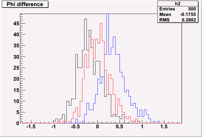 I haven't fully tested this, but here are some results for 500 photons @ theta = 90 degrees (1 GeV) where the shift is biggest. Black - old code (negative phi shift), blue - after my changes to PndEmcXtal (positive phi shift), red - using axis vector (phi shift seems mostly gone).