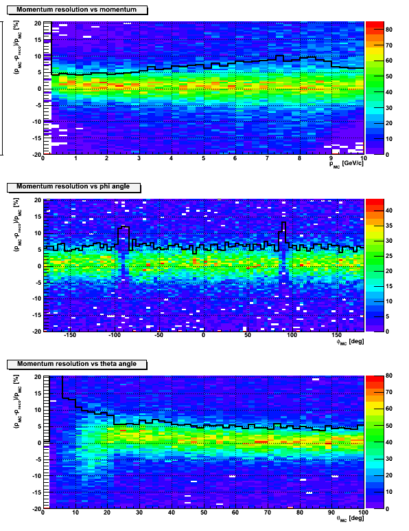 The histograms are 2D, with X axis being the momentum, phi or theta, and Y axis being the momentum resolution. The histogram is then sliced and to each slice a gaussian function is fitted. The sigma of the fit is plotted as the black curve.