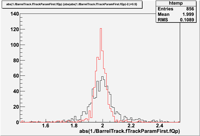 Works and fits the tracks. Below is the histogram showing the reconstructed momentum after PndBarrelTrackFinder (black curve) and after the fit applied (red curve). In this particular case 2 GeV muons were simulated.