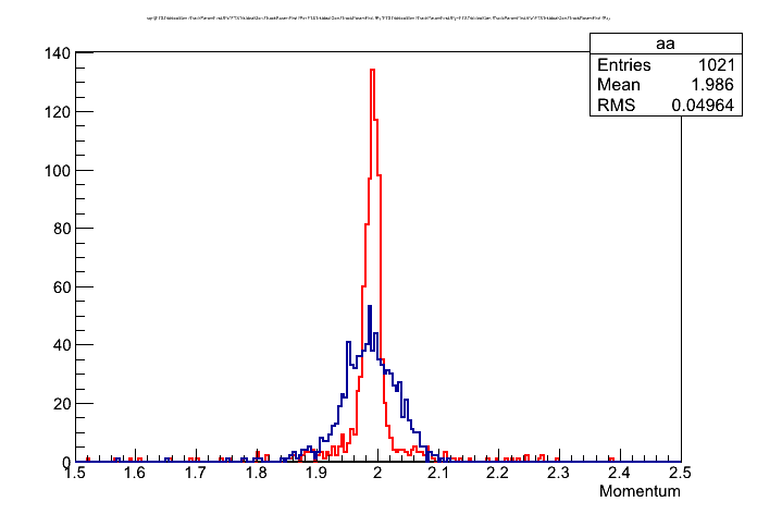 You can see the momentum distribution, in blue after the ideal tracking setting a p smearing of 2% (of course the distribution has a width of 2%), and in red after the kalman task, obtaining a new momentum resolution of 0.6%.