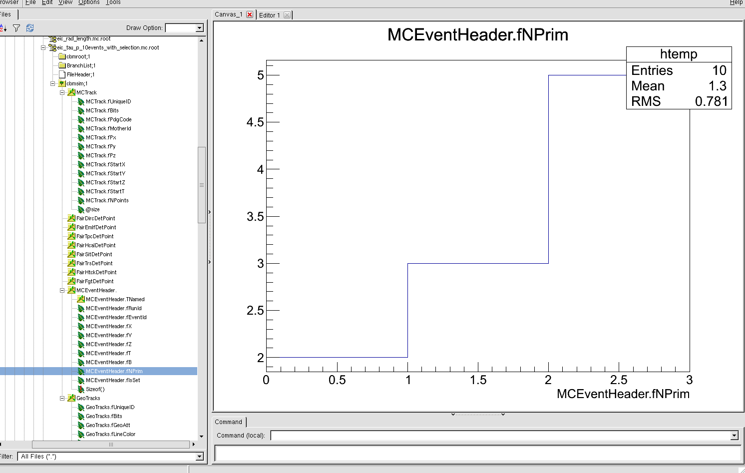 MCEventHeader.fNPrim, if I were to guess, I would say you have 10 events in total: 2 events with 0 primaries, 3 with 1 primary and 5 events with 2 primaries.