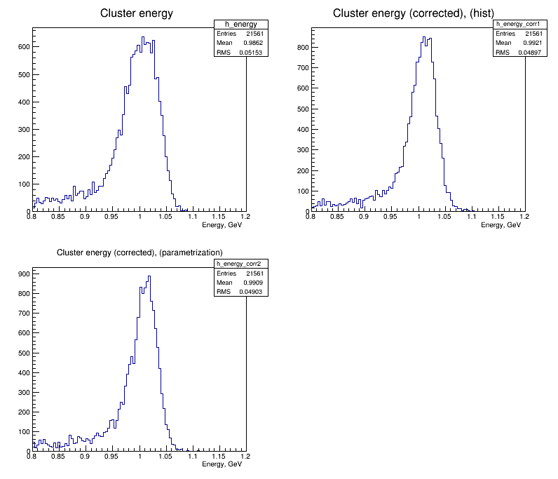 Here some plots which demonstrate how applying non-uniformity change reconstructed emc energy. I do not know if it's by accident or by intention of Christian Hammann who provided non-uniformity parameters from measured data in case of barrel EMC correction is almost not needed, i.e. 1 GeV energy peak is centred around 1 GeV. But for endcaps correction is still needed anyway.