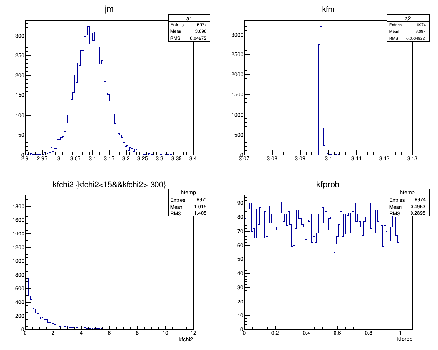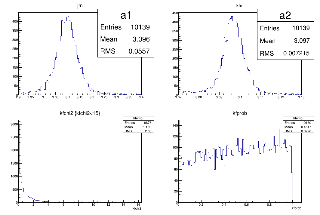 You can see the original invariant mass, the fitted invariant mass (RMS from 48 MeV to 50 KeV), chi2 peaked around 3 (4 degrees of freedom), flat probability between 0 and 1.