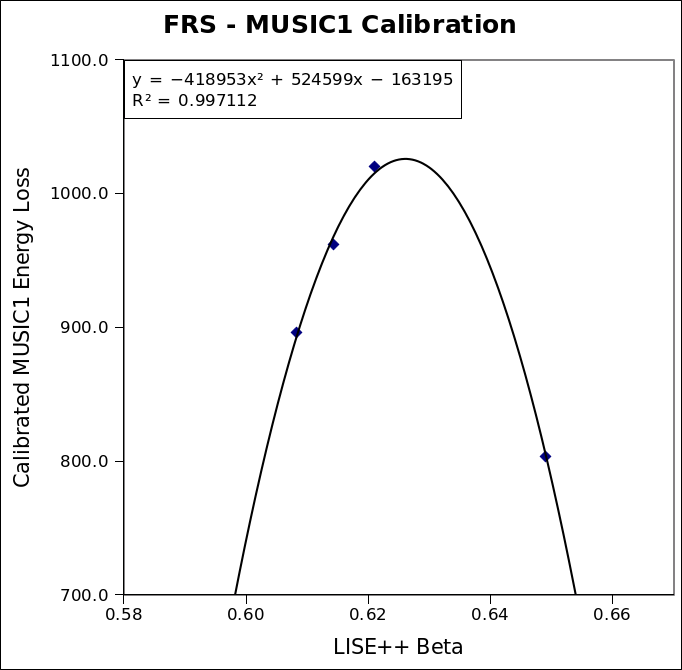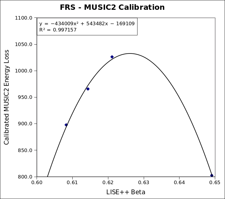 - Plotted 'aligned MUSIC1(or MUSIC2) energy loss vs LISE++ Beta' (see attached) and extraced a, b and c from quadratic fit (a + b*\beta + c*(\beta)^2).