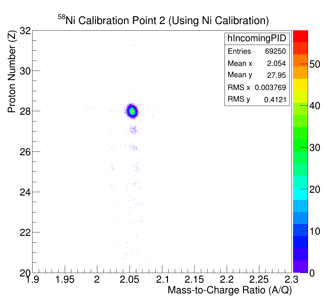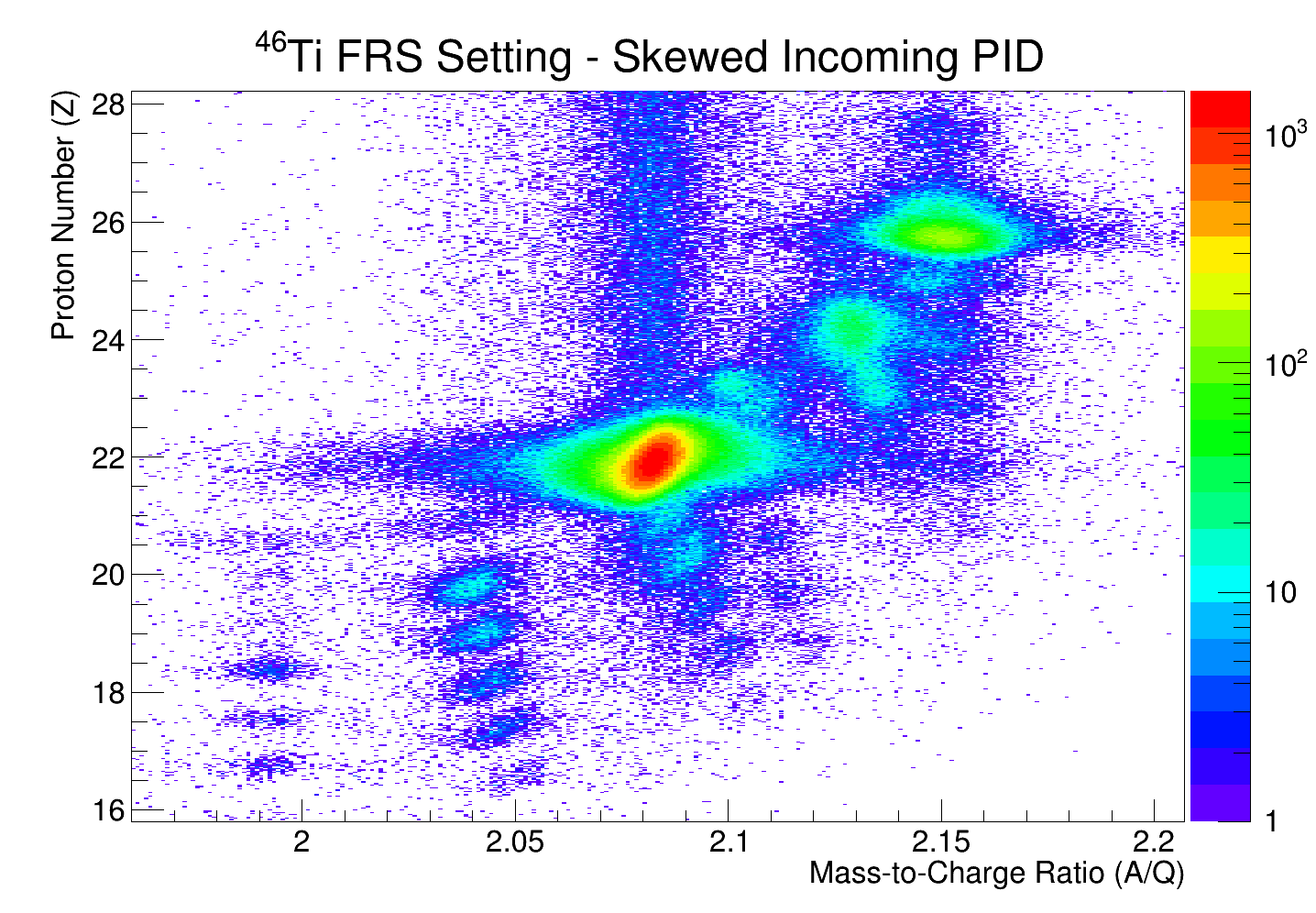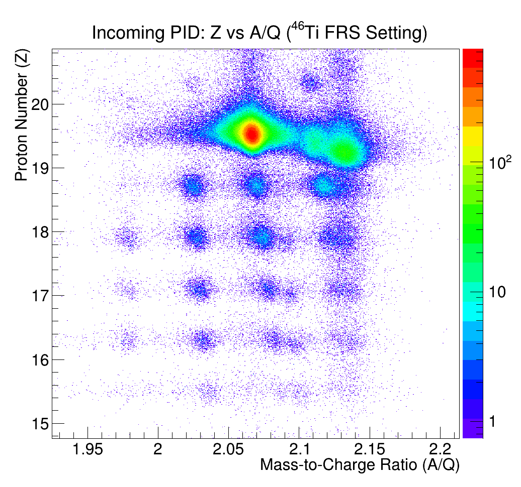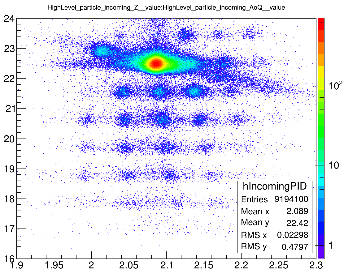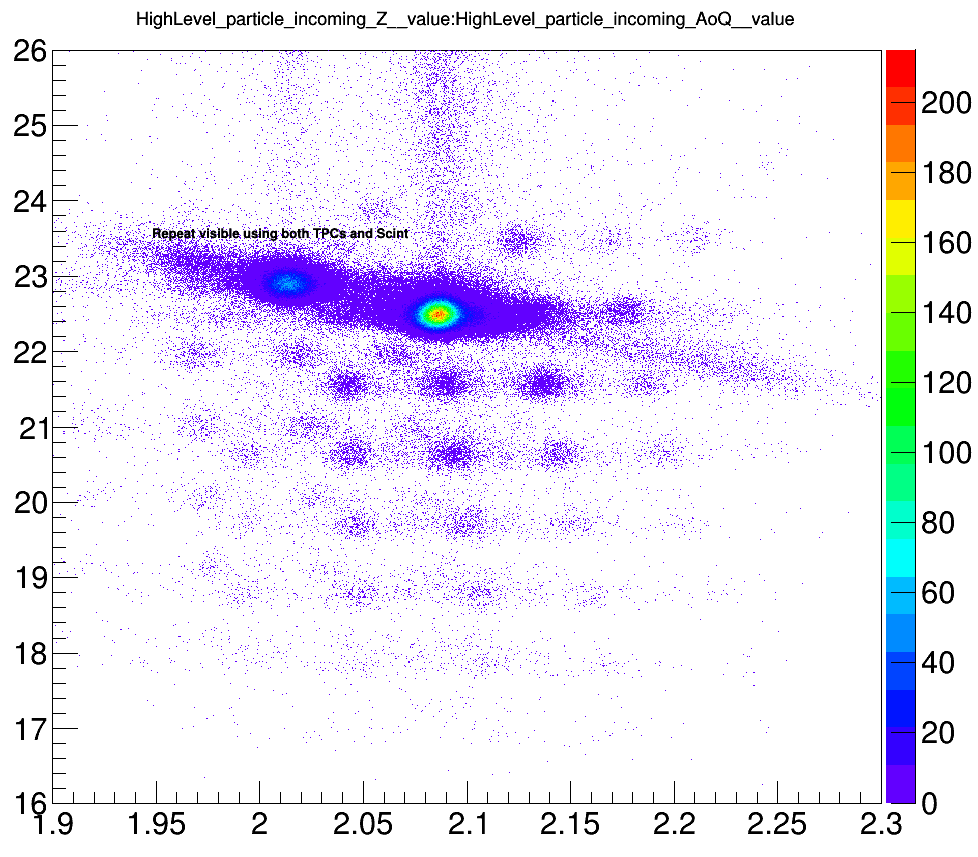 The result is below. I'm still not convinced, maybe I am being naive but I had expected the nuclei to be in the correct place, i.e. for 46Ti, Z=22 and A/Q=2.09. In addition, I don't know what is causing some 'blobs' to look slightly double, my TPC mask calibrations worked perfectly, so don't know what the problem there is. Perhaps my PID is fine and there are some offsets I need to use to simply put it in the right place?