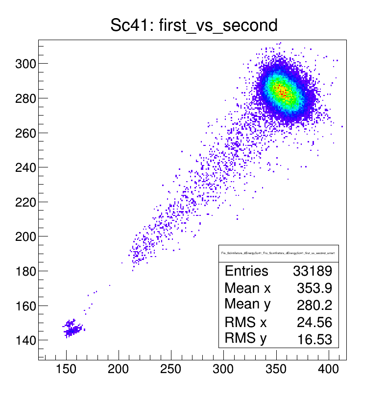 - I performed the cut you suggested and applied it to the FRS PID (using scintillators), it does appear to clean it up nicely though it does reduce it by quite a few statistics, I'll need to investigate next week just exactly how many of them statistics are from the 46Ti 'blob', my cut was quite rough though. I put in the FRS PID (using the TPCs) for a comparison, there is a factor of ~3.5 less stats in the PID compared to using scintillators (+cut on S4 position vs dt left-right).