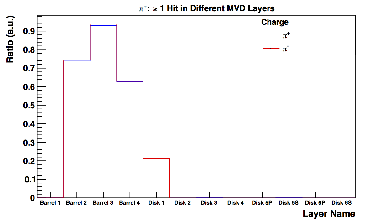 The data shown is from a box generator simulating events with two positively charged pions and two negatively charged pions. The theta angle is fixed to 60°. For GEANT 3, about 92 % of all π- produce at least one hit in layer 3, while only 80 % of all π+ produce at least one. The hits are counted using an ideal MC track finder and following the FairLinks back to the MVDPoint.