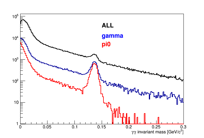 From the plot I can argue that the MC matching works almost nicely, that the candidates are dominated by particles which are not photons, and that in the pi0 invariant mass there is still a low momentum tail. I could argue that the tail is coming from broken clusters (like between endcaps and barrel, or maybe problems of the clusterization, or maybe splitoffs).