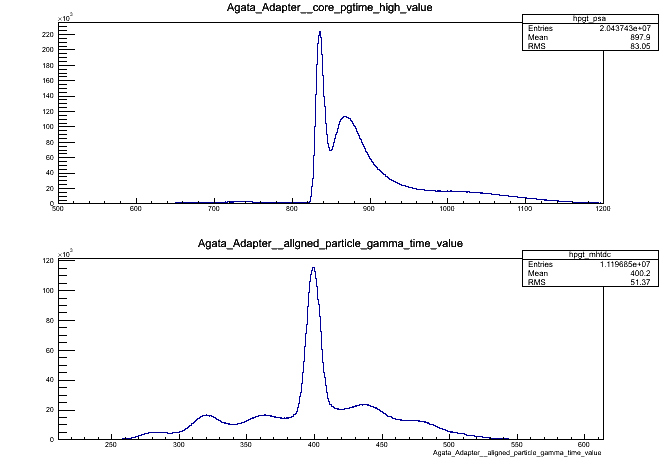 The AgataAdapter processor computes from these quantities the particle-gamma time difference and provides it in the output arrays "core_pgtime_high" (using the T0 field in the PSA frame) and "core_pgtime_low" (using the T1 field in the PSA frame).